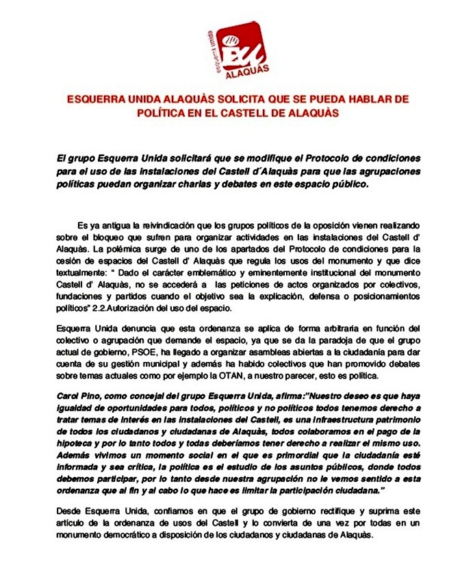 ESQUERRA UNIDA ALAQUAS SOLICITA QUE SE PUEDA HABLAR DE POLITICA EN EL CASTILLO DE ALAQUAS