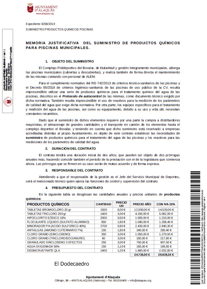 ALAQUAS LICITA EL SUMINISTRO DE PRODUCTOS QUIMICOS PARA LAS PISCINAS MUNICIPALES , 103.540,00 €